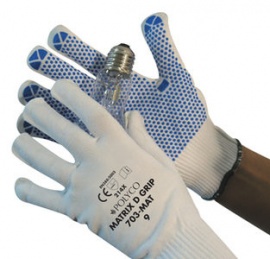 DescriptionKnitted synthetic yarn glove, PVC dot grip palm, elasticated wrist.
