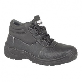 DescriptionBlack leather ankle boot with steel toe cap and protective midsole.