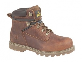 DescriptionVintage brown leather Derby boot, welted rubber sole.